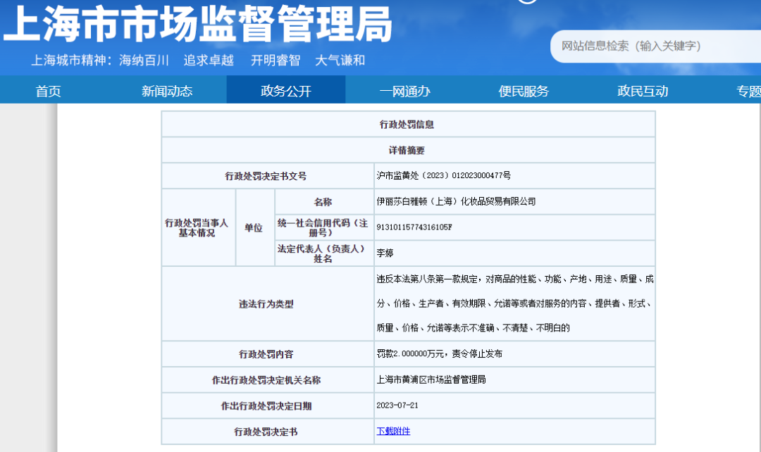 鉴于此,上海市黄浦区市场监督管理局认为,伊丽莎白雅顿违反了《广告法》第八条第一款“广告中对商品的性能、功能、产地、用途、质量、成分、价格、生产者、有效期限、允诺等或者对服务的内容、提供者、形式、质量、价格、允诺等有表示的,应当准确、清楚、明白”的规定,构成发布对商品价格未做清楚表示的广告的行为,责令立即停止发布违法广告,并罚款2万元。